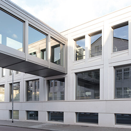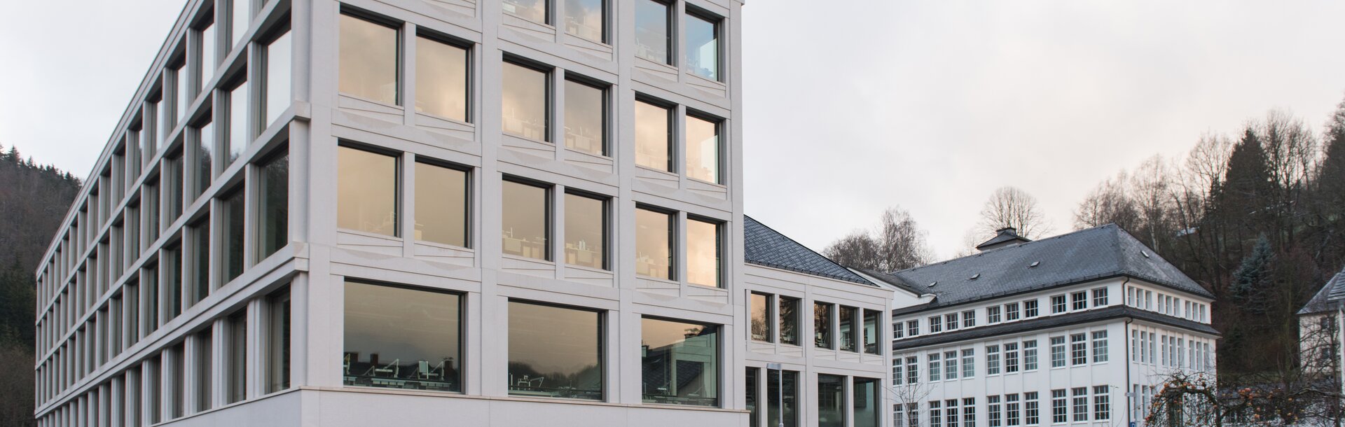 Das Gesamtbild zeigt jetzt schlichte Zurückhaltung und harmonisches Zusammenspiel mit den beiden bereits bestehenden Gebäuden – eine gläserne Brücke verbindet hier im wahrsten Sinne Tradition und Moderne. So wirkt die Industrieanlage nun wie eine Fortsetzung der jahrhundertelangen Handwerkstradition: nicht protzig, überheblich und modisch, sondern so, wie man sich eine Uhrenmanufaktur wünscht – zeitlos!