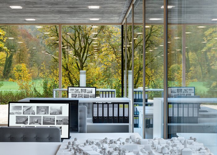 Im Inneren paart sich nun zeitgemäße Ausstattung und Technik mit der historischen Bausubstanz. An den alten Holzbalken haftet noch Kalkstaub, die Betonwände der Steinschütten fungieren als natürliche Raumteiler. Ergänzt werden sie durch einen kreativen Einfall, den das Braunger-Wörtz-Team hier gleich auf etwaige Kundentauglichkeit überprüfen konnte: Steingraue Schallschutzvorhänge lassen eine flexible Veränderung der Raumsituation zu. So wurde aus dem ehemaligen Terrazzowerk nun eine Architekturwerkstatt mit hoher Arbeitsplatz- und Aufenthaltsqualität, ein lebendiger Zeitzeuge und belebtes Kulturerbe, das nicht nur die Mitarbeiter und Besucher begeistert: Die subtile Transformation wurde 2020 mit dem Hugo-Häring-Preis für vorbildliche Bauwerke in Baden-Württemberg ausgezeichnet!