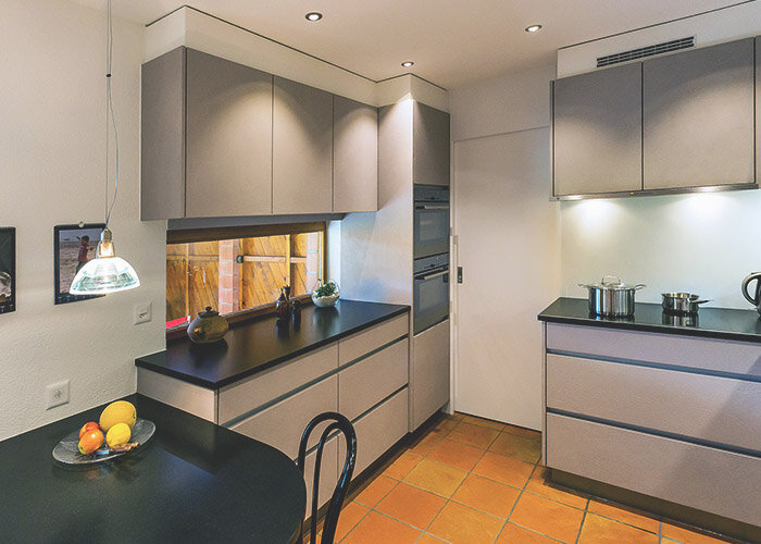 Doch Holzfronten sollten es nicht mehr werden, zumal auch sonst im Haus sehr viel Holz zu sehen ist. Auch andere moderne Oberflächen sagten den Fricks nicht zu: „Wir haben in neuen oder umgebauten Küchen von Bekannten viele verschiedene Oberflächen gesehen, oft glänzend, entweder in Weiß oder mit viel Farbe, die man bald satt haben kann. Wir wollten eher wenig Farbe, da unsere Küche dunkle Holztüren und einen Plattenboden aus roter Florentiner Keramik hat.“ Frau Frick wollte auch nichts Glänzendes, sondern strukturierte Fronten, aber eben kein Holz. Und da hatte Beat Jäger, der Projektleiter der Schreinerei Schilling, als ADLER-Kunde die richtige Lösung zur Hand: