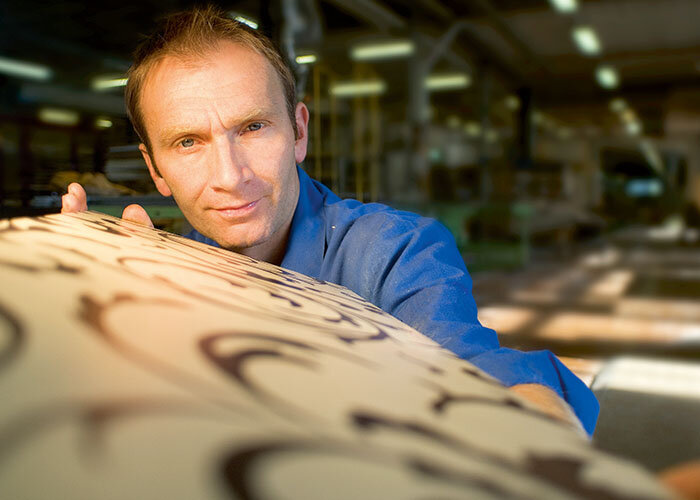 Wie alle Forcher-Möbel präsentiert sich die Küche schlicht, klar und geradlinig. Den hölzernen kubischen Korpus bedeckt eine Arbeitsplatte aus dem italienischen High-Tech-Material Fenix: Die supermatte Nano-Oberfläche ist kratz- und schlagfest, antibakteriell und hitzeresistent. Doch zum wahren Blickfang macht die Küche die außergewöhnliche „Ombre“-Lackierung: „Wir haben sie eigens für die Konzeptküche entwickelt“, schildert Profer. Die Frontfarbe verläuft hierbei von einem hellen zu einem dunkleren Ton. Möglich machen das die ruhige Hand, das gute Auge, das handwerkliche Geschick und die Erfahrung des Lackierers Hans Gomig (links im Bild) – und die Patinabeize von ADLER. Der Leiter der Forcher-Oberflächenabteilung bringt die mit dem Farbkonzentrat ADLER Solva-Tint abgetönte Beize von Hand auf. „Dadurch bekommt der Verlauf eine Lebendigkeit, die sich maschinell nie erreichen ließe“, schwärmt Profer. Zuvor wurde der Eichenkorpus mit ADLER PUR-Strong grundiert. Eine Deckschicht mit ADLER Legnopur schützt die Schönheit der Küche. Sich so den Sonnenaufgang in die Küche zu holen, ist eine grandiose Idee. Hoffen wir, dass aus dem Prototypen bald eine Forcher-Kollektion wird!