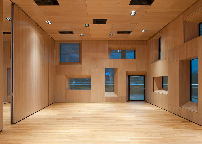 Die Seminarräume, in die man auch vom Foyer aus gelangt, sind ganz in Holz gehalten. Großflächig kommt Eiche zum Einsatz, die mit ADLER Legnopur farblos lackiert und bestens geschützt ist. Damit kann das Holz in seiner natürlichen Farbgebung optisch zur Geltung kommen und schafft in den Seminarräumen eine Atmosphäre von Schlichtheit und Ruhe, in der es sich bestens Arbeiten lässt.