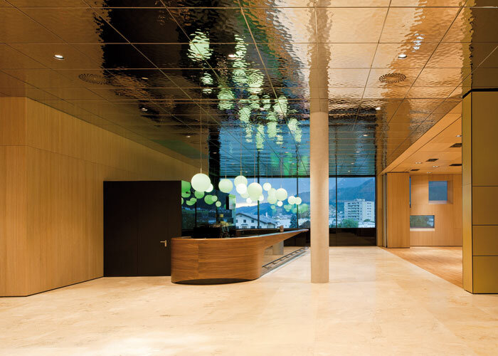 Besucherinnen und Besucher erreichen das SZentrum von dem neu entstandenen Stadtplatz aus über eine großzügige, überdachte Freitreppe. Das weit auskragende Vordach mit seiner dreidimensional reflektierenden Untersicht zieht die Besucher förmlich in das Foyer. Diese Decke wird im Inneren des Foyers weitergezogen und suggeriert eine doppelte Raumhöhe, die einen erhabenen Eindruck vermittelt. Farben, Bewegungen, Stimmungen spiegeln sich in der Decke wider. Die Bar ist edel in amerikanischem Nussholz gestaltet und farblos lackiert mit ADLER Legnopur. Das Foyer ist als halböffentlicher Raum konzipiert, von dem aus der visuelle Bezug zu der Stadt Schwaz mit seiner Umgebung ein wichtiges gestalterisches Element ist.