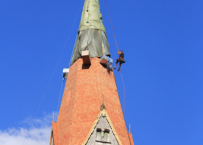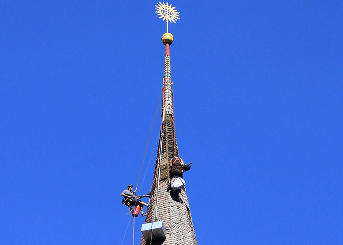 Mehr als 300 Stunden verbrachten die Arbeiter der Firma Astner am Seil, bis das Werk vollendet war. Das letzte i-Tüpfelchen waren die neu vergoldeten Kugeln, die an den Giebeln angebracht wurden. Jetzt ist der Turm des Herrn in Jenbach wieder fest – und nicht nur das: Er ist auch schöner als je zuvor.