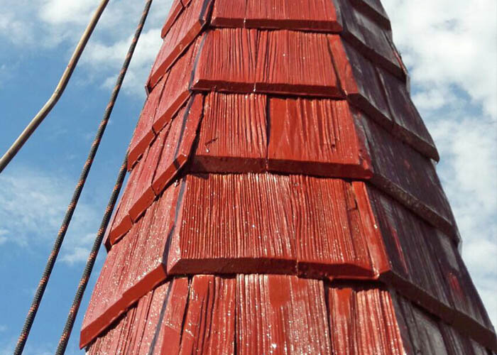 Alle Schindeln wurden noch im Betrieb in Pullex Imprägniergrund getaucht. Eine Spezialität der Astners, die als Einzige in Tirol diese Technik anwenden. „Der Vorteil ist, dass der Holzschutz für die ganze Schindel gegeben ist“, erklärt Mathias Astner. „Wenn man, wie sonst üblich, nur die schon verlegten Schindeln imprägniert, bleibt viel Holz ungeschützt.“ Tausende Schindeln wurden anschließend in luftigen Höhen verlegt und mit Nägeln befestigt. Jede Schindel ist unterschiedlich breit, sodass man eine Art Mosaikkünstler sein muss, um sie optimal am Dach anzubringen. Kein Problem für das Team von Astner, das den Kirchturm zusätzlich sogar mit Mustern im Schindeldach verzierte. Anschließend wurden die rundum-imprägnierten Schindeln gestrichen, und zwar mit Pullex Color im für die Innsbrucker Diözese, zu der Jenbach gehört, typischen Farbton Oxidrot.