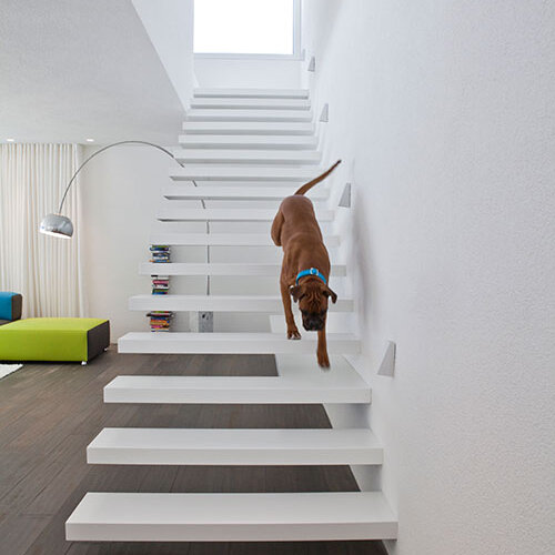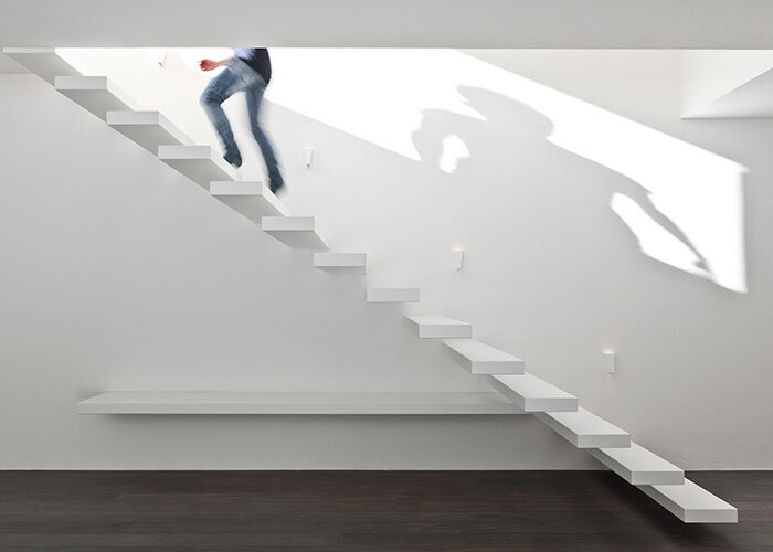 Treppen gibt es viele. Wangentreppen, Bolzentreppen, Satteltreppen, Spindeltreppen, Faltwerktreppen. Die höchste Herausforderung sind jedoch auskragende Treppen: Wie frei schwebend ragt hier jede Stufe für sich aus der Wand. Die Treppe ist auf das absolute Minimum reduziert und besticht durch ihre Leichtigkeit und Eleganz. Ein Vorzeigestück dieser anspruchsvollen Treppenart hat der Südtiroler Treppenbaubetrieb Thomaseth geschaffen. In einem Einfamilienhaus in Corvara im ladinischen Gadertal führt nun eine wahrhaft himmlische Aufstiegshilfe in höhere Sphären.
