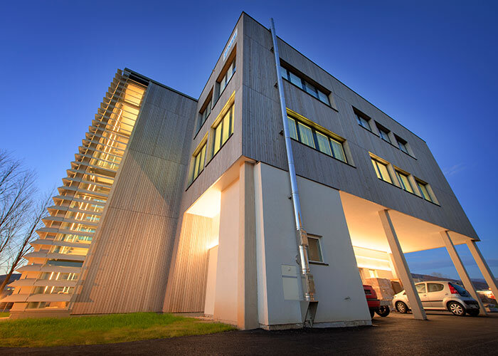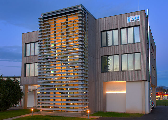 Anfangs war eine Melaninharzfassade angedacht“, schildert Baumeister DI Franz Hausleitner, der mit seiner „Plan-Werkstatt“ den luftigen Zubau kreierte: „Aber wir wollten dann lieber den Holzbau deutlich sichtbar machen.“ Der Planer hat sich nicht umsonst für diese Baumethode entschieden: „Der Trockenbau mit Holz ist ökologisch, nachhaltig, kosten- und zeitsparend“, ist er begeistert. Beispiel gefällig? Der Rohbau begann an einem Montag, am folgenden Donnerstag war er schon fertig! Für die Erweiterung stülpte die Firma Lieb Bau Weiz Brettsperrholzplatten quasi über das bestehende, (zu) kleine Pessl-Gebäude darüber. Der neue Kubus umhüllt nun praktisch den Altbestand. Das vorgesetzte Stahl-Glas-Treppenhaus mit den waagrechten Beschattungslamellen bildet einen spannenden Kontrast zu der längsgelatteten Lärchenfassade. Dank des silbergrauen Farbtons erstrahlt das Pessl-Gebäude tagsüber im hellen Sonnenschein und auch nachts durch die energiesparende LED-Beleuchtung (wie sie übrigens auch im gesamten Haus zum Einsatz kommt) stets im besten Licht. Der helle, luftige Holzbau sorgt für ein angenehmes Raumklima. Was sagen dazu wohl Wetterexperten? Die idealen Voraussetzungen für ein gesundes Wachstum!