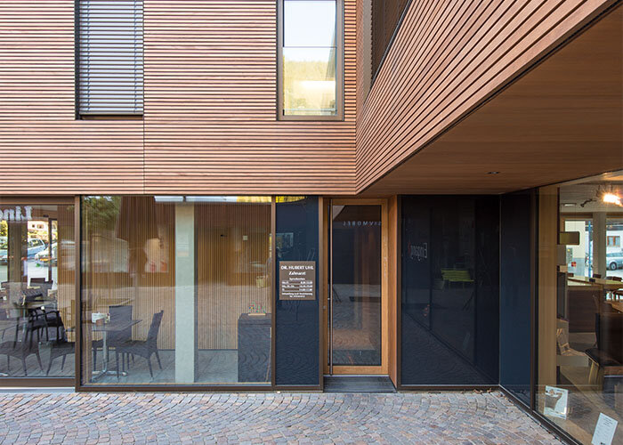Der Bauherrschaft Wilhelm Schillinger und Edith Chrobok, den Geschäftsführern der Fensterbau Erich Schillinger GmbH, war es wichtig, im Dorfkern einen neuen Mittelpunkt für die Dorfgemeinschaft zu schaffen. Deshalb bietet das Gebäude nicht nur Platz für den Wohnraum von Edith Chrobok, sondern auch für eine Bäckerei mit Café, ein Möbelgeschäft, den Friseur und eine Zahnarztpraxis. Das Geniale daran: Vom Dorfplatz aus sieht man ein modernes, aber bodenständiges Holzhaus mit Satteldach, das ganz selbstverständlich zum dörflichen Charakter des Standorts passt. Der flachere Langbau, der darin anschließt, tritt in den Hintergrund. So wirkt der Bau bescheiden und bietet dennoch großzügig Raum für alle Nutzungen. Hinzu kommt, dass das Erdgeschoß als „Sockelzone“ aus einer komplett transparenten, verglasten Pfosten-Riegel-Fassade besteht. Sie hebt den oberen Baukörper „komplett von der Ladenzone ab“ und lässt „ihn darüber schwebend erscheinen“, wie es in der Jurybegründung von „Neues Bauen im Schwarzwald“ heißt. So erzeugt das Gebäude „sein konsequent reduziertes und dennoch absolut kraftvolles Erscheinungsbild“.