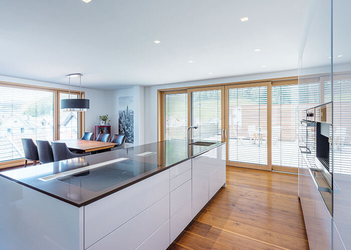 Auch bei den selbst gefertigten Holz-Alu-Fenstern legten die Bauherren Wert auf Natürlichkeit: außen sind sie in dezentem eloviertem Alu geschalt, aber innen wirkt das Schwarzwälder Weißtannenholz ganz zart und unbehandelt. Das liegt an der Beschichtung mit Aquawood Natureffekt – ein sehr matter Lack, den man weder sieht noch spürt. Wer so ein Fenster berührt, fühlt nur echtes Holz – das aber trotzdem vor Vergilbung und anderen Schäden geschützt ist. So ist den Bauherren gemeinsam mit den Architekten das „Faust’sche“ Kunststück gelungen, dem Ortskern von Oberwolfach genau die Gestalt zu geben, die seinem Wesen schon immer eingeschrieben war; und ein Gebäude zu errichten, das den Bewohnern langfristig eine lebendige Infrastruktur bietet.