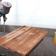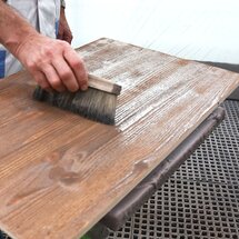 Im Spritzverfahren tragen Sie die Beize von zwei Seiten nass in nass mit starkem Überschuss in Holzfaserrichtung auf – die Auftragsmenge beträgt ca. 150 bis 200 g/m2. Vertreiben Sie gleich anschließend die Beize gründlich, indem Sie sie mit einem weichen Pinsel oder einer weichen Bürste quer und längs zur Faserrichtung ausziehen. Alternativ kann die Beize auch im Streichverfahren aufgetragen werden. In diesem Fall arbeiten Sie die Beize mit einem weichen Pinsel zur Faserrichtung in das Holz ein.