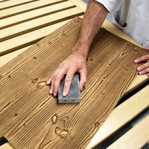 Behandeln Sie das gebürstete Holz mit einem leichten Glättschliff mit Körnung 100, um die Oberfläche leicht zu glätten. Entfernen Sie danach gründlich den Schleifstaub.