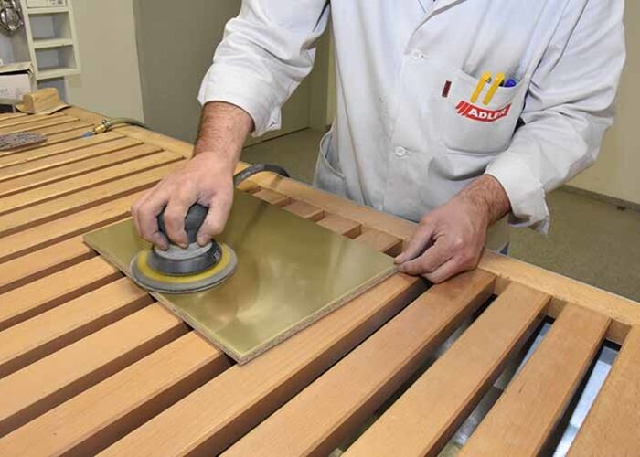 Die ideale Basis für die ADLER Echtmetallbeschichtung ist PUR-Ecofill Weiß. Nach einmaligem Spritzauftrag wird die gefüllerte, trockene Fläche direkt vor dem Lackieren mit Körnung 240 angeschliffen.