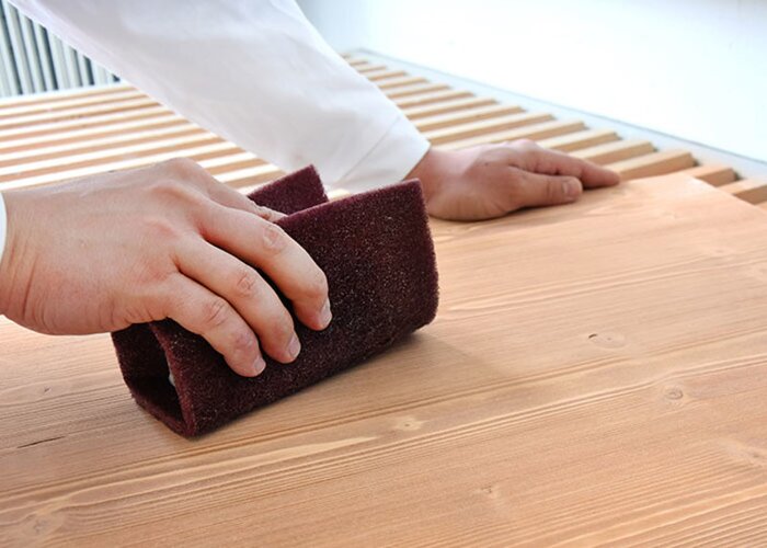 Nach 4 Stunden Trockenzeit wird mit Aquawood Protor-Base L farblos grundiert und nach wiederum 5 Stunden Trocknung können Sie schleifen und damit die harten Jahresringe abtragen: mit Körnung 120 oder Scotch Brite. (Merke: Alt heißt nicht verstaubt, also Schleifstaub sorgfältig entfernen!)