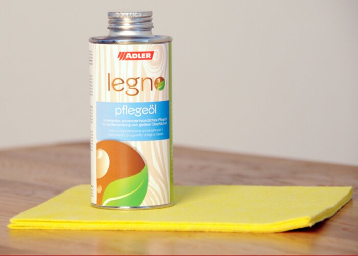 Tragen Sie das Legno-Pflegeöl oder Legno-Hartwachsöl dünn mit dem ADLER-Pflegetuch auf. Nach ca. 5 Minuten Trockenzeit können Sie die Fläche mit einem Wolltuch auspolieren.
